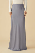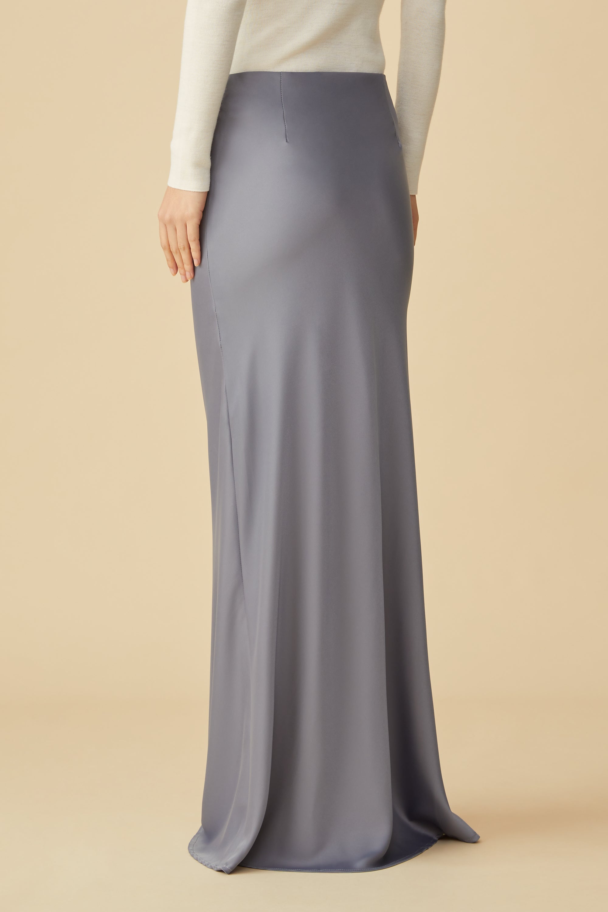 This silver gray maxi satin skirt will add an elegant touch to any look. It has a comfortable high-rise waist and maxi fishtail hem which falls like liquid silver. Dress it up with a fine-knit sweater and strappy sandals, or try a more casual look with a crisp white shirt and trendy mules.
