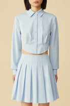 This blue cropped shirt combined influence of traditional corsetry and drew attention to the waist. It's made from a breathable and lightweight TENCEL™ polyester-blend fabric with a hint of stretch for comfort. Style yours with a matching pleated mini skirt or wide legged jeans.